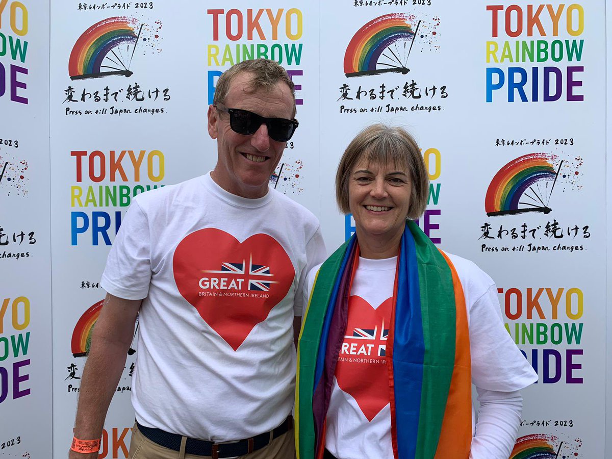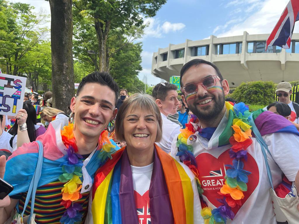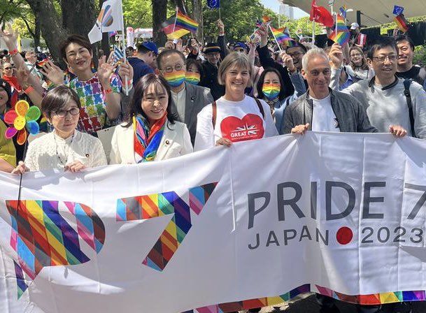 東京レインボープライド2023 @Tokyo_R_Pride で @JuliaLongbottom 大使が、🇬🇧に住む娘の同性婚が家族にとって最良の日であったことをスピーチし、 @G7 の同僚とプライドパレードに参加しました。